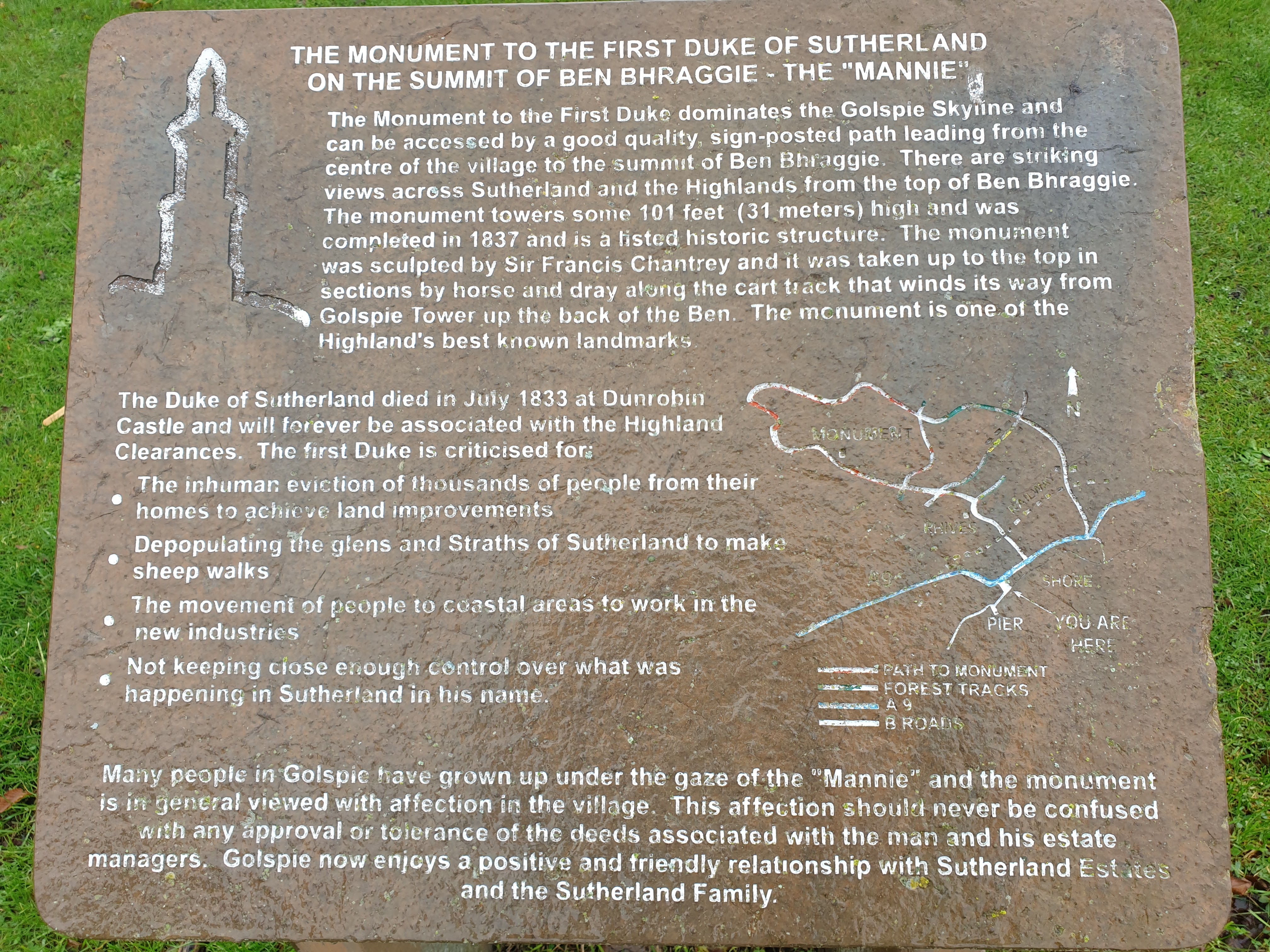 Golspie sits beneath Ben Bhraggie and the monument to the First Duke of Sutherland can be seen for miles. The first information board (stone?) lists some information about this Duke, he is not viewed with much fondness and history records him as an awful person.