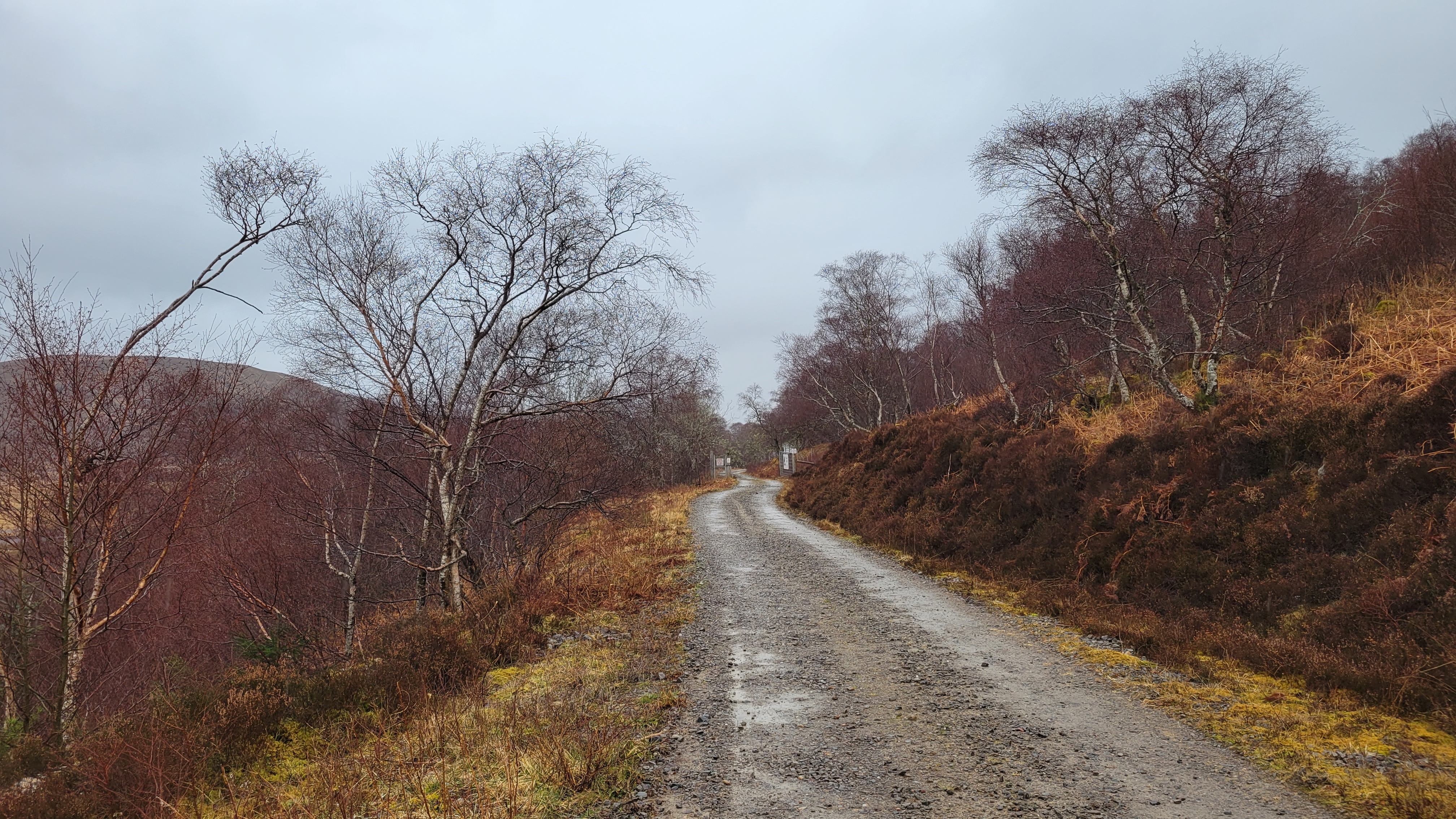 Off the path on our left was a sign warning about fire risk but given how open it was, the ground was covered in at least an inch of water, the fact it was raining and there was snow on the top of the hills, we hoped we’d be safe enough.